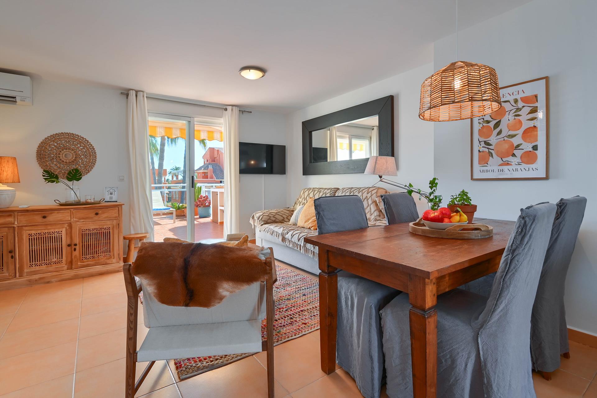 El apartamento tiene 2 dormitorios y 2 cuartos de baño, distribuidos en 2 plantas. El alojamiento ofrece un bonito jardín privado con césped y árboles, un jardín comunitario con césped y árboles y unas maravillosas vistas a la piscina y al jardín. El confort y la cercanía de la playa, sitios para salir, actividades deportivas, lugares para ir de compras, lugares de interés y cultura hacen de este apartamento un alojamiento apropiado para pasar sus vacaciones en España con familia o amigos.