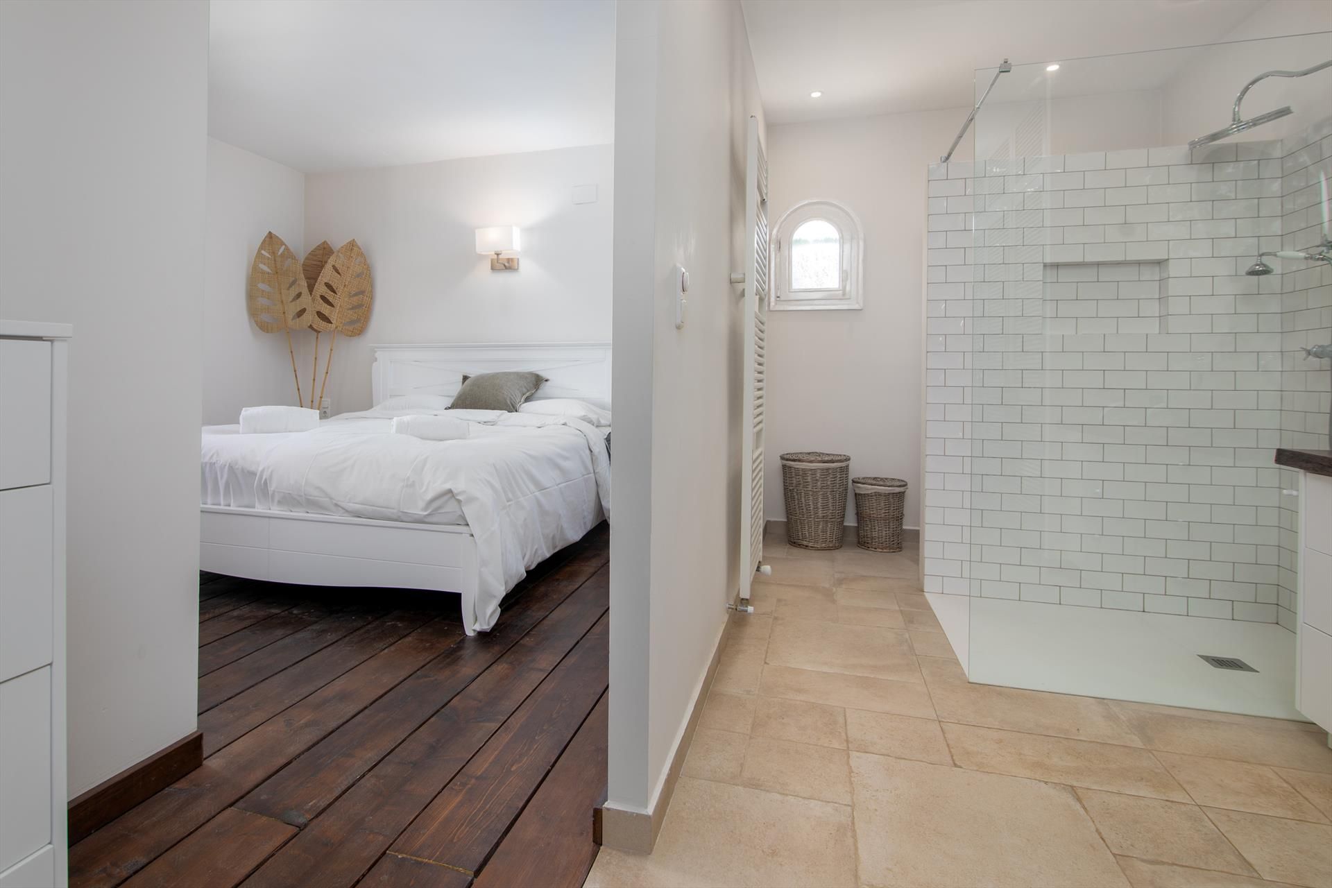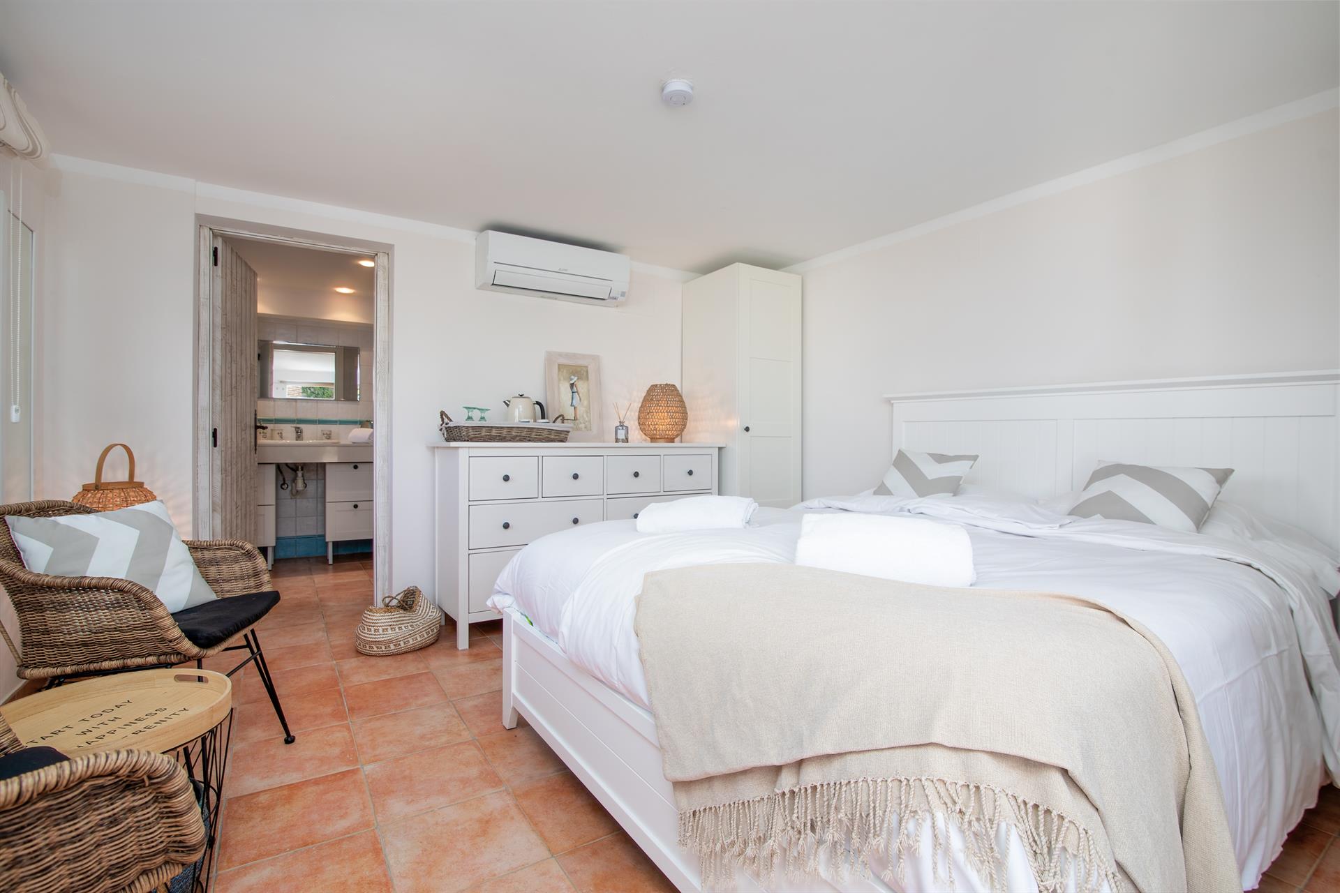 • dormitorio con aire acondicionado, cama king size y baño en suite