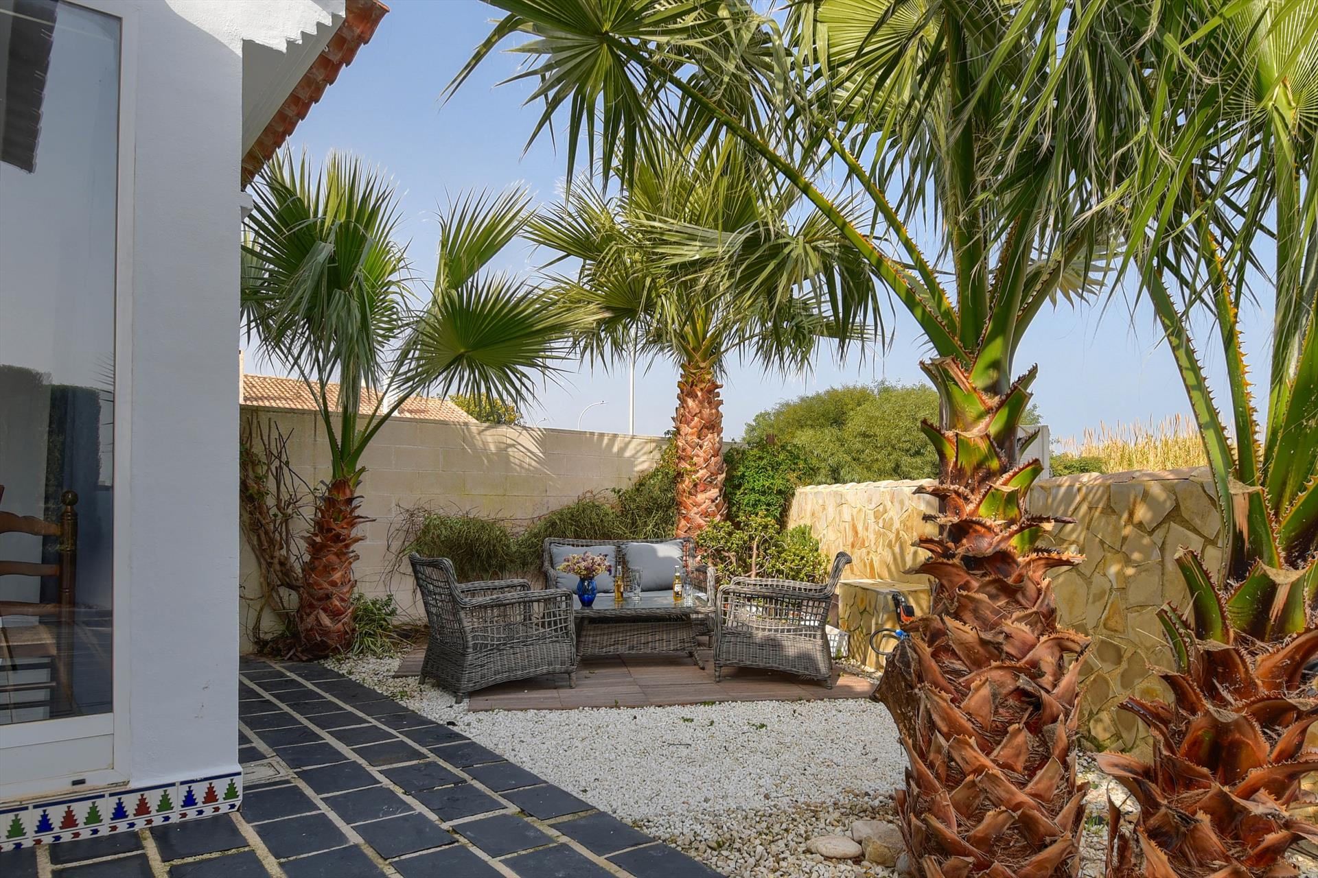 La vivienda tiene 2 dormitorios y 1 cuarto de baño. El alojamiento ofrece un jardín con árboles. La cercanía de la playa, sitios para salir, actividades deportivas, lugares para ir de compras, lugares de interés y cultura hace de esta casa un alojamiento apropiado para pasar sus vacaciones en España con su familia, sus amigos y sus mascotas.