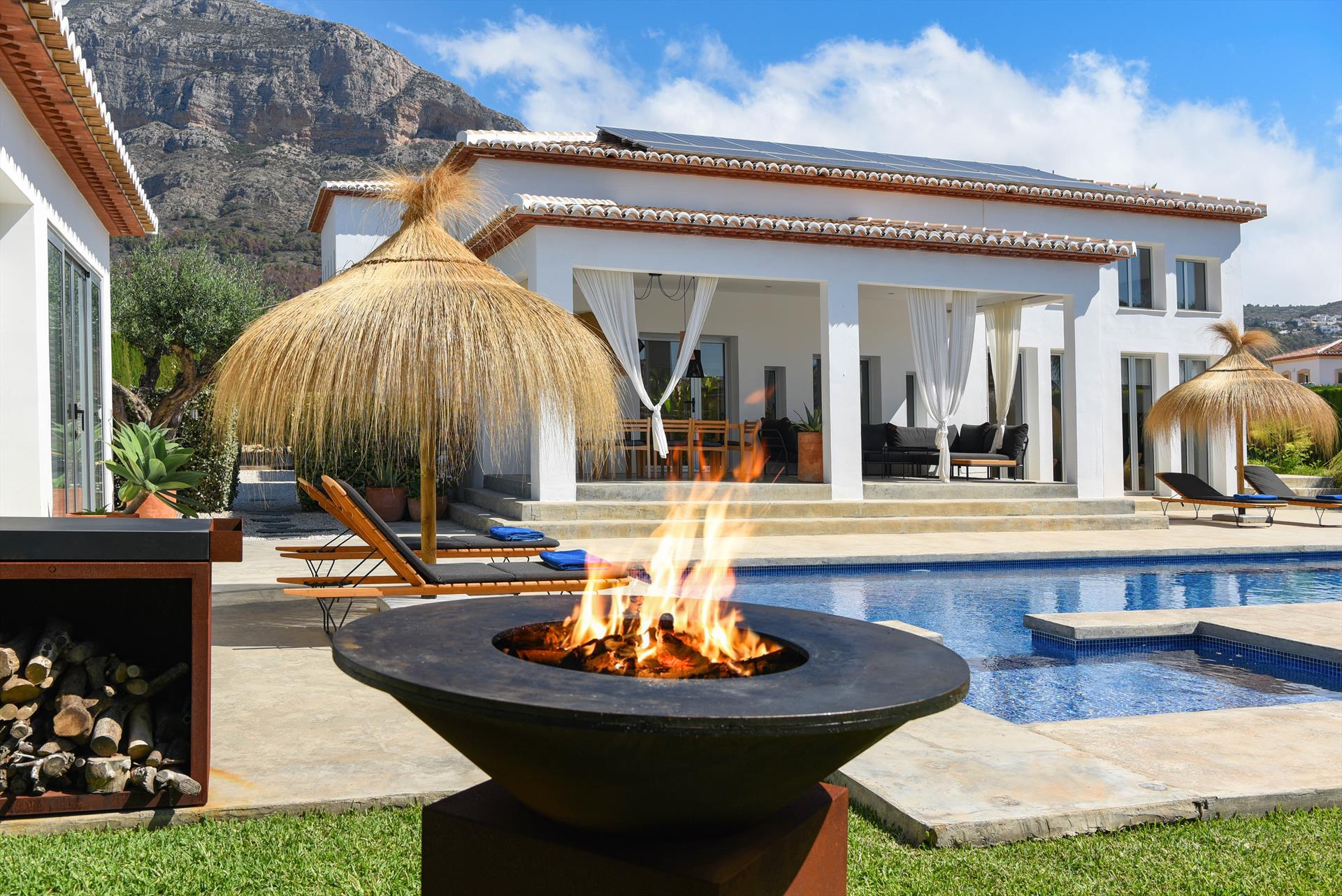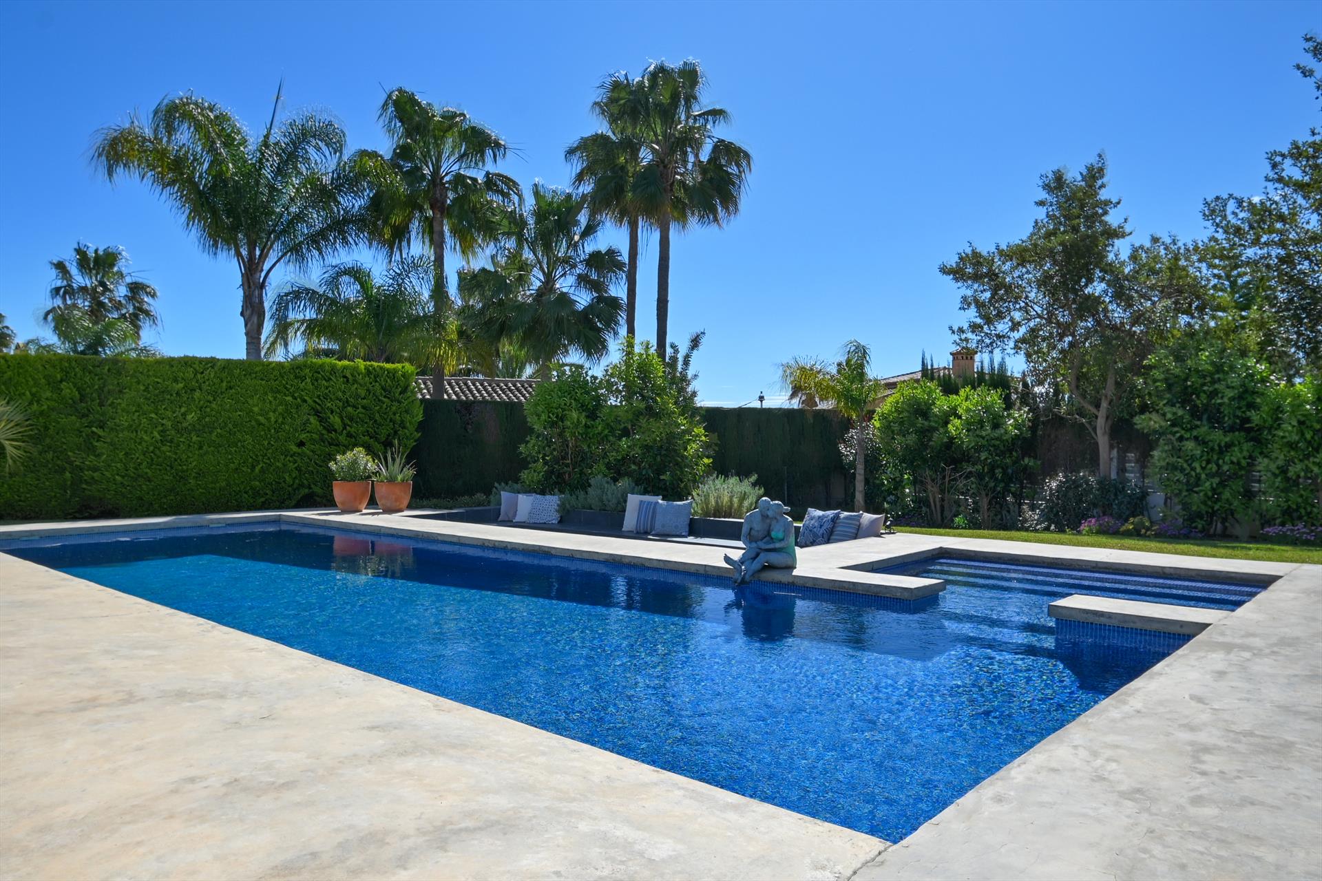 La villa cuenta con 4 dormitorios y 4 baños, distribuidos en 2 niveles. El alojamiento ofrece mucha privacidad, un maravilloso jardín con césped, grava y árboles, una hermosa piscina y vistas preciosas a la montaña. Su confort y la proximidad a la playa, áreas comerciales, actividades deportivas, lugares de entretenimiento, sitios de interés y cultura hacen de esta villa el lugar perfecto para disfrutar de sus vacaciones en España con familia o amigos.