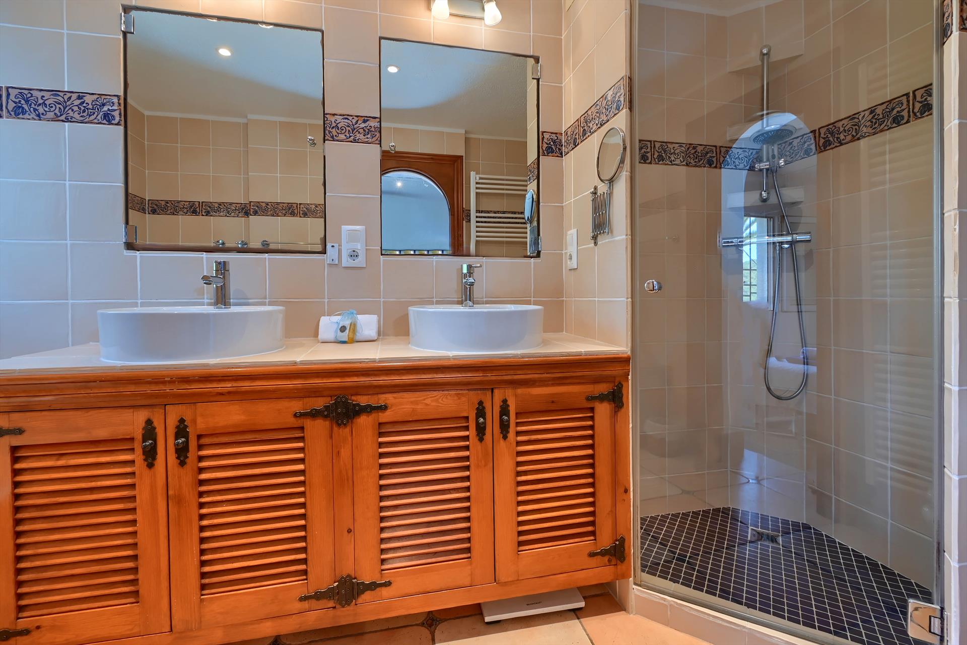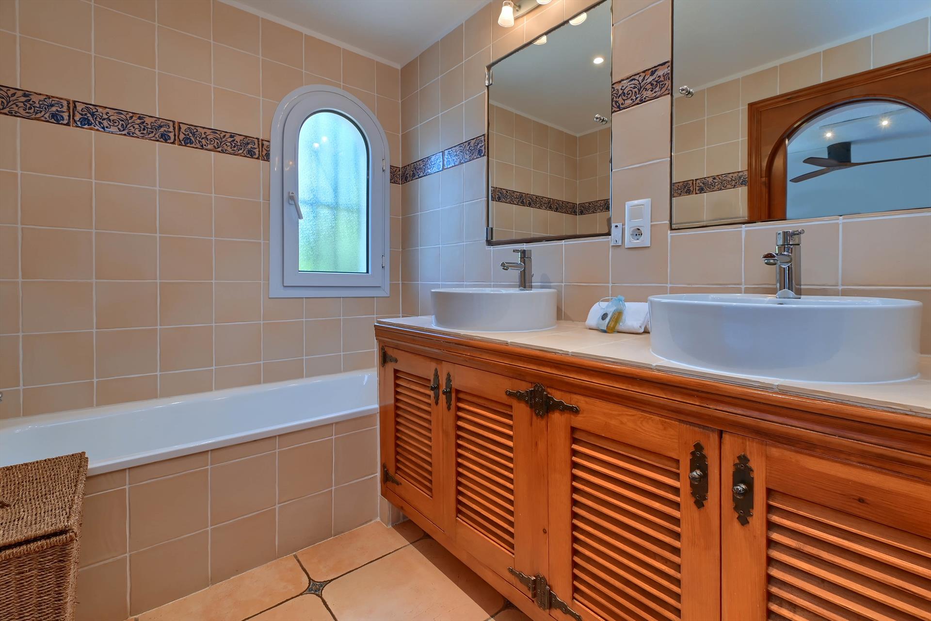 • cuarto de baño en suite con lavabo doble, bañera, ducha y water