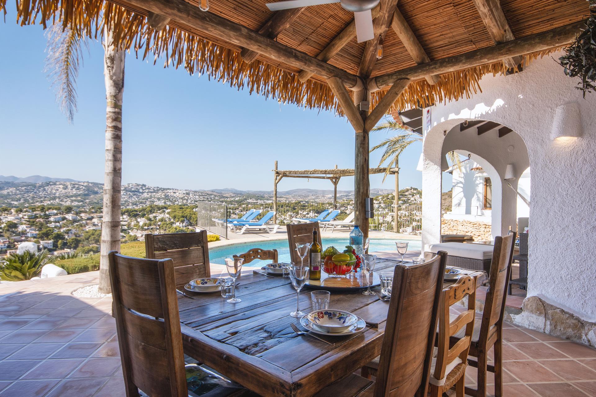 Amplia y confortable villa con piscina privada en Moraira, Costa Blanca, España para 6 personas. La casa está situada en una zona residencial de playa y está a 1 km de la playa de El Portet.