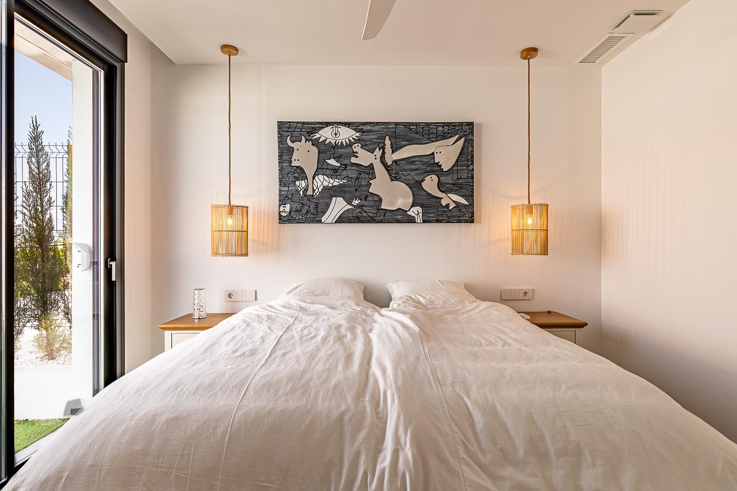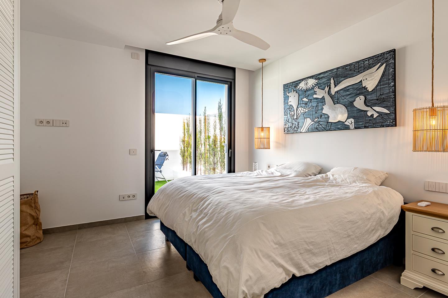 • dormitorio con cama king size (medida 210 por 180 cm), ventilador y baño en suite