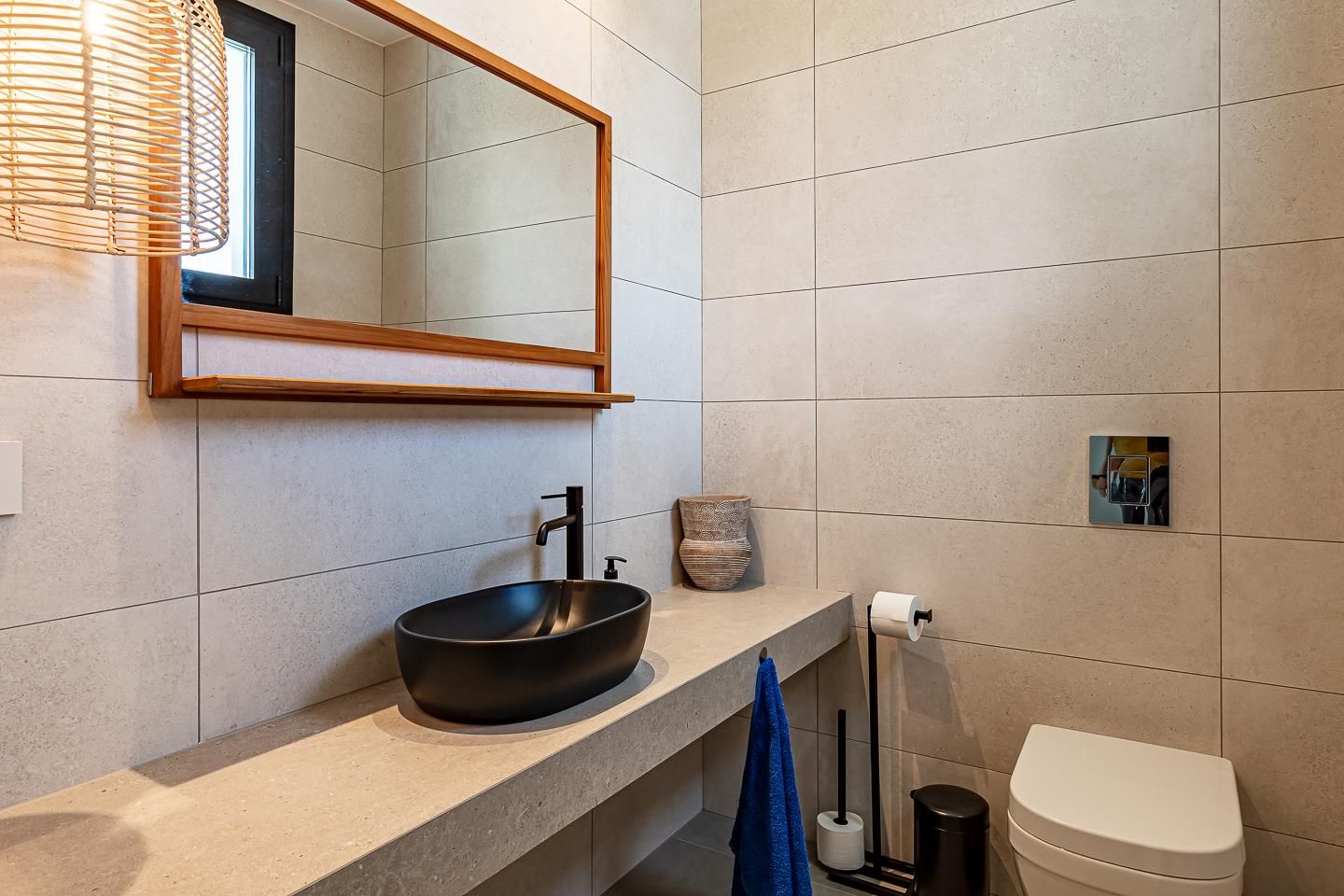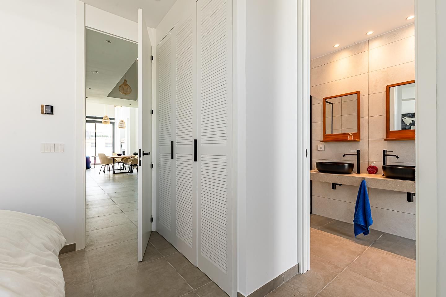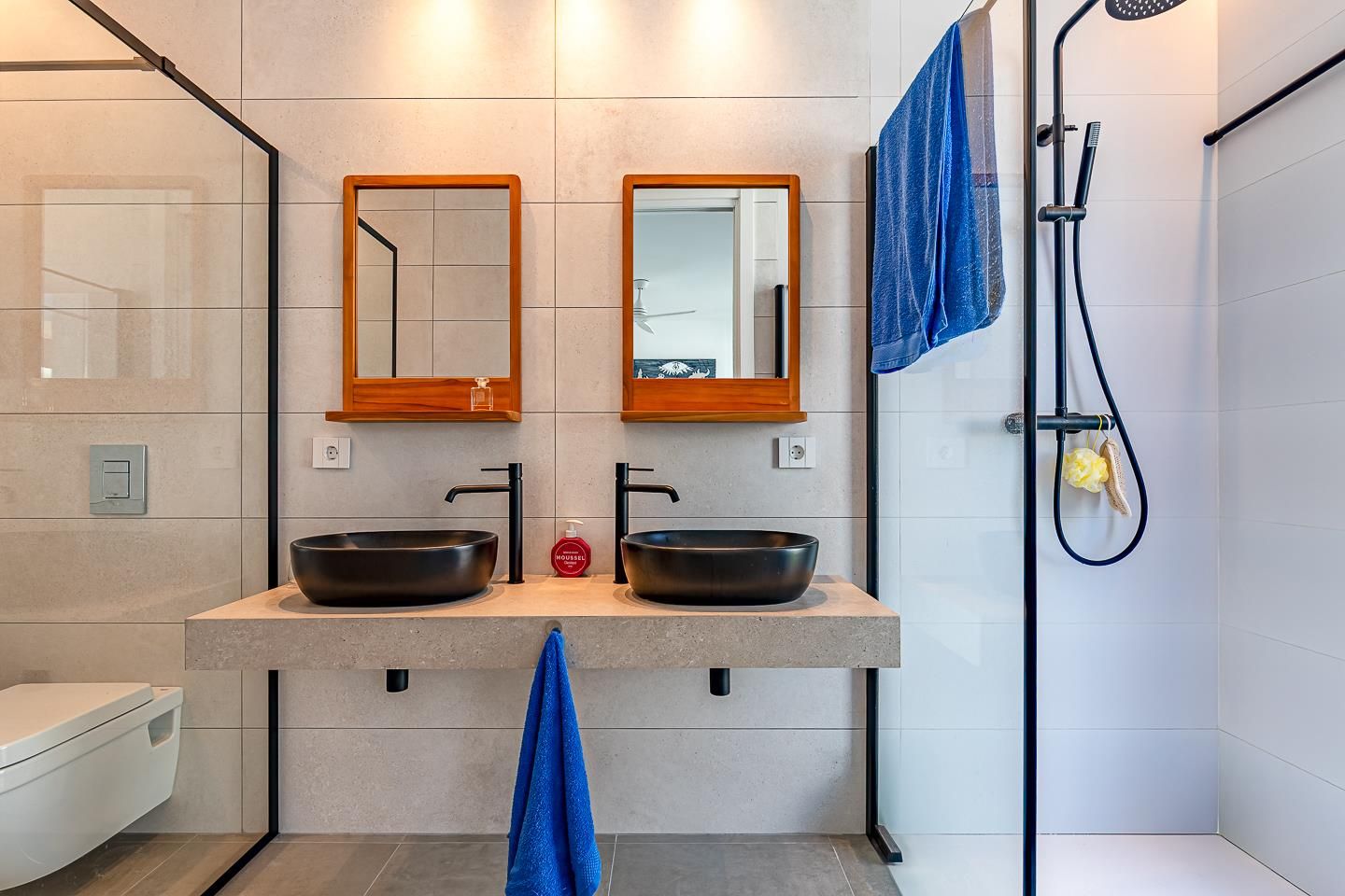 • baño en suite con lavabo doble, ducha, inodoro y secador de pelo