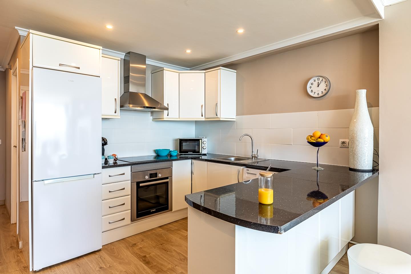 • cocina abierta con placa de inducción, horno eléctrico, microondas, frigorífico-congelador, cafetera, hervidor eléctrico, batidora y tostadora