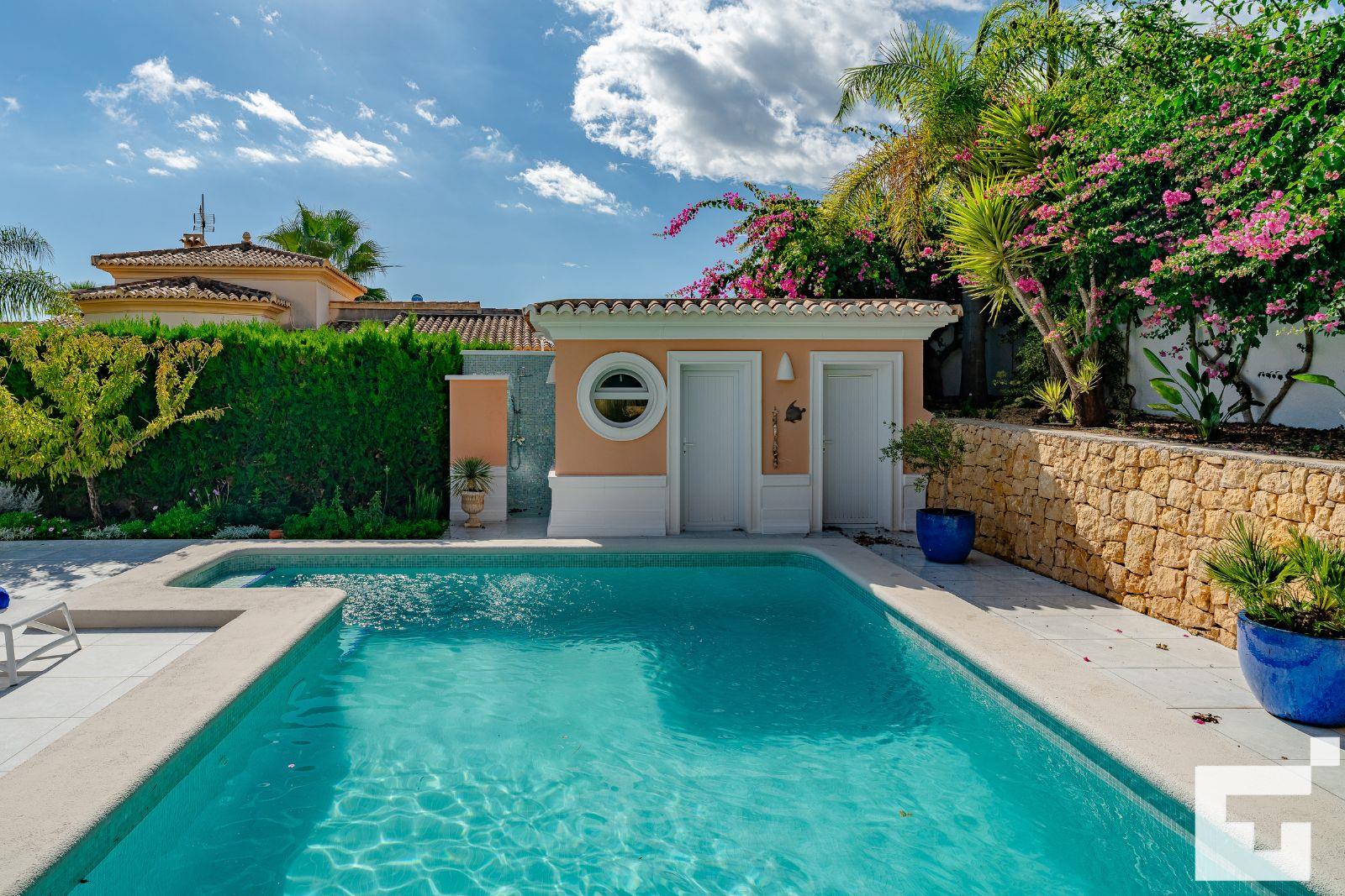 La vivienda cuenta con 3 dormitorios y 2 baños. El alojamiento ofrece mucha privacidad, un hermoso jardín con césped, grava y árboles, una magnífica piscina, y una vista del valle y las montañas. Su comodidad y la proximidad a la playa, tiendas, actividades deportivas y opciones de entretenimiento hacen de esta villa un lugar ideal para pasar sus vacaciones en España con familia o amigos.