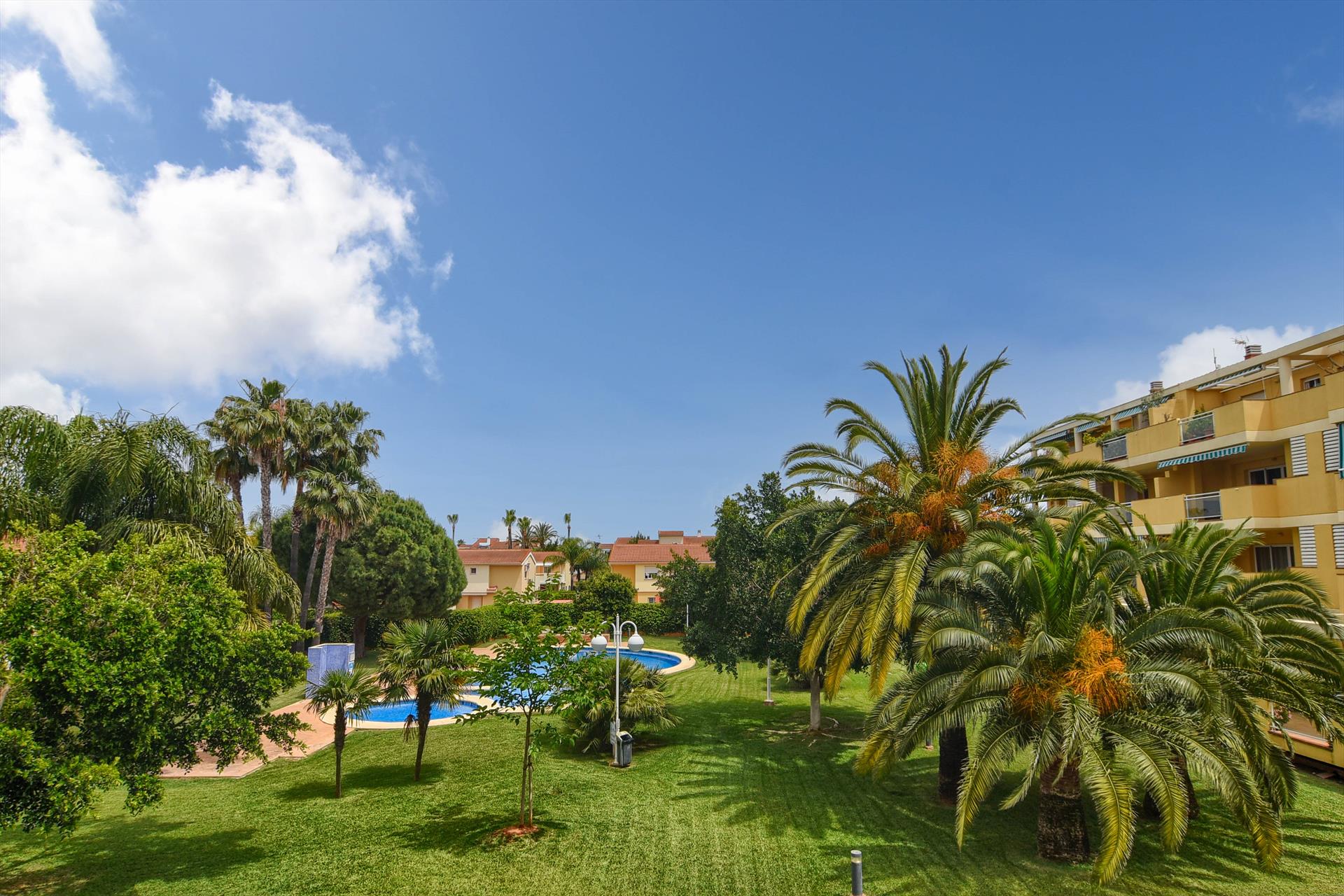 Apartamento maravilloso y acogedor en Denia, Costa Blanca, España con piscina comunitaria para 4 personas. El apartamento de vacaciones está situado en una zona de playa y residencial, cerca de restaurantes y bares, a 500 m de la playa de Las marinas y a 0,5 km de Mediterraneo.