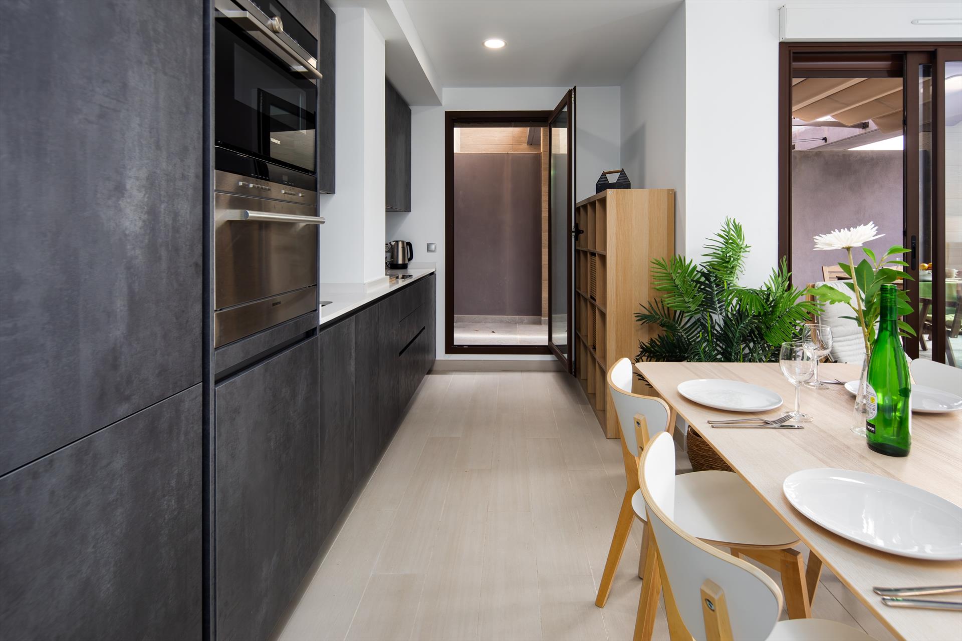 • cocina abierta con placa eléctrica, microondas, lavavajillas, frigorífico-congelador, cafetera, hervidor eléctrico y tostadora
