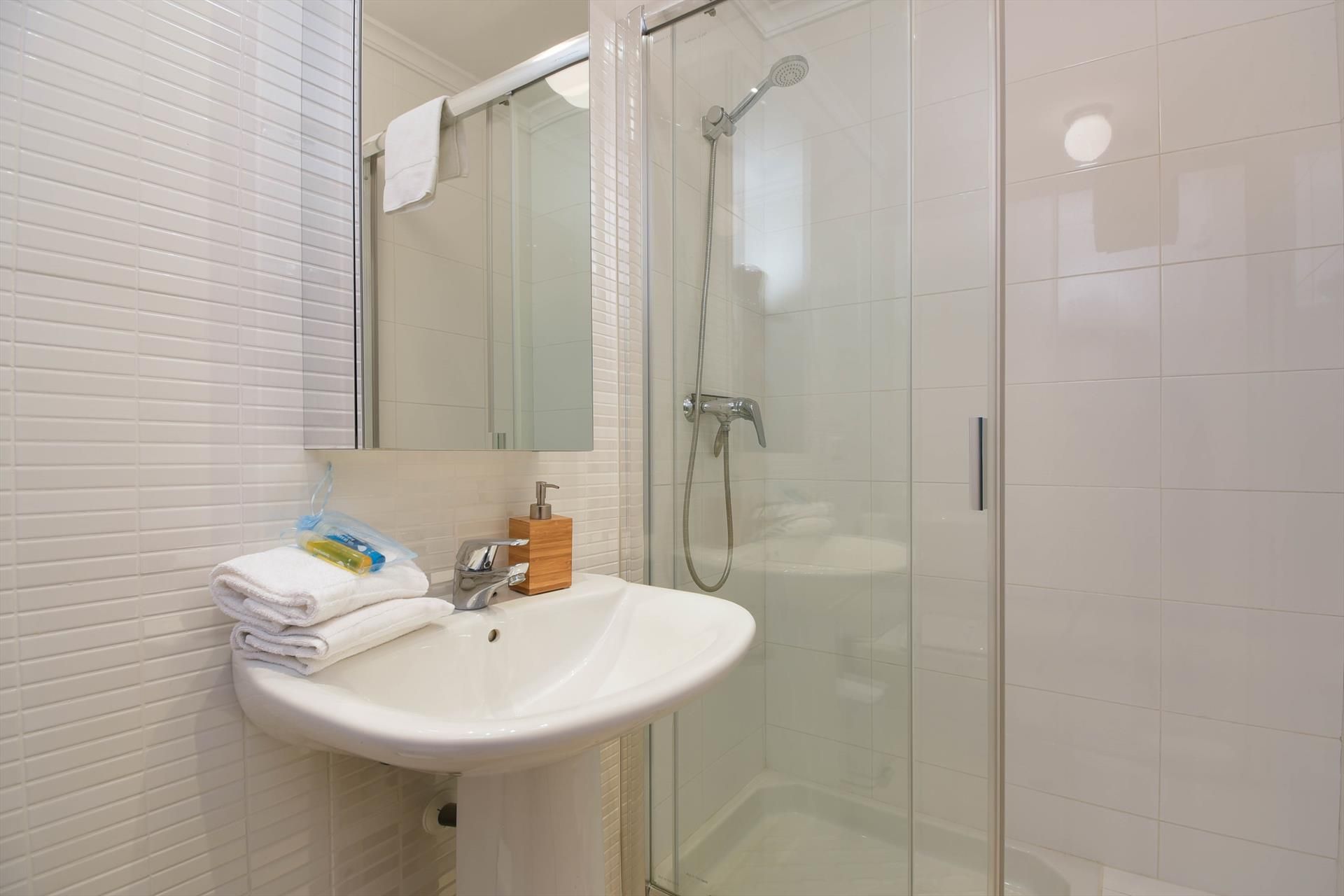• cuarto de baño con lavabo, ducha, water y secadora de pelo