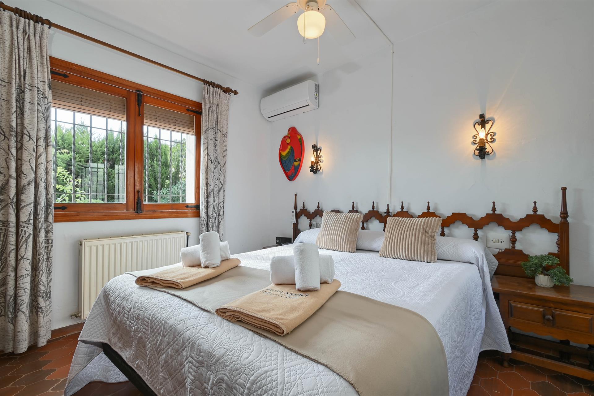 • dormitorio con aire acondicionado, cama doble y ventilador