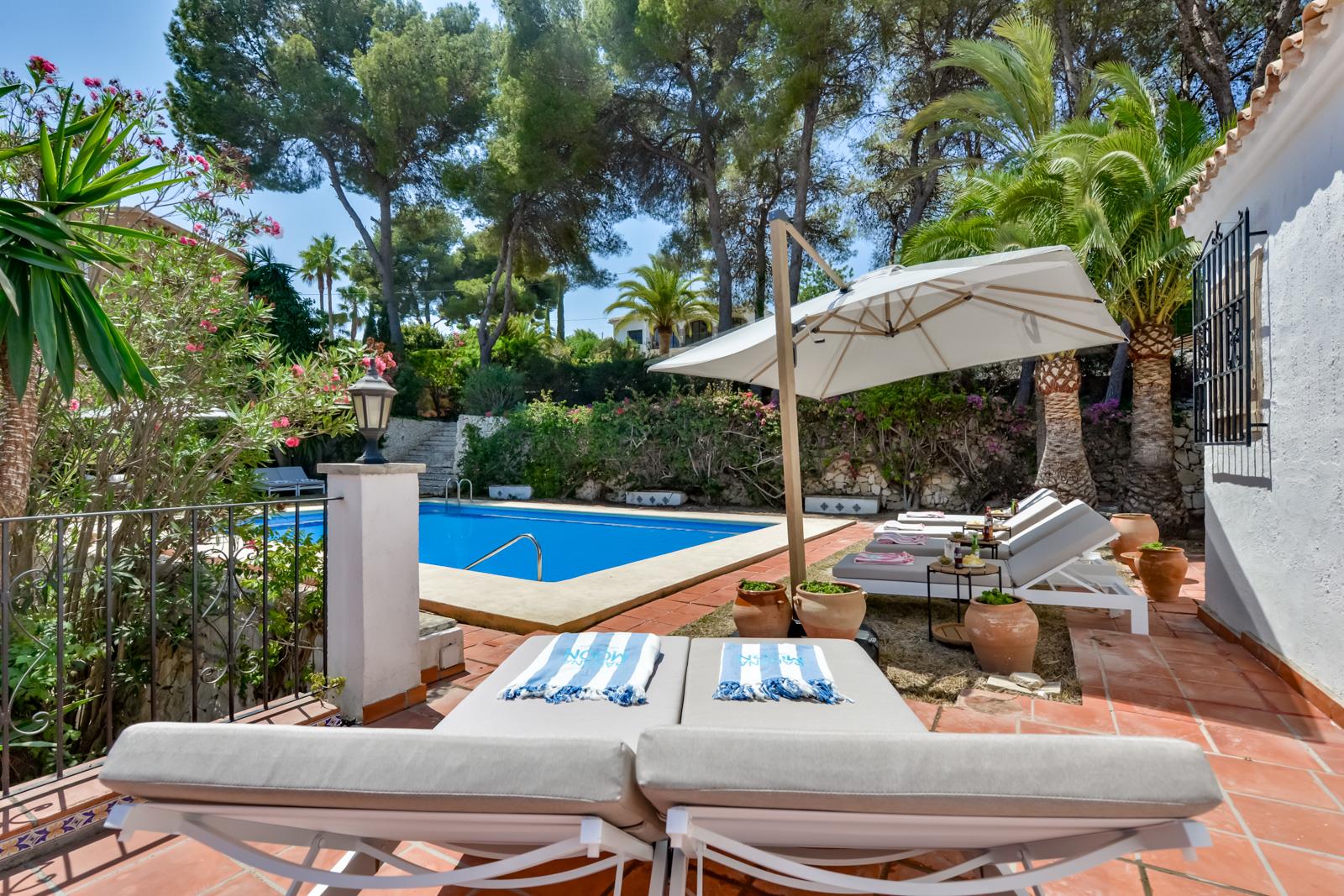 Amplia y encantadora villa en Xàbia, Costa Blanca, España, con piscina privada para 8 personas. La casa está situada en una zona residencial de playa y a 3 km de la playa El Arenal, Xàbia.