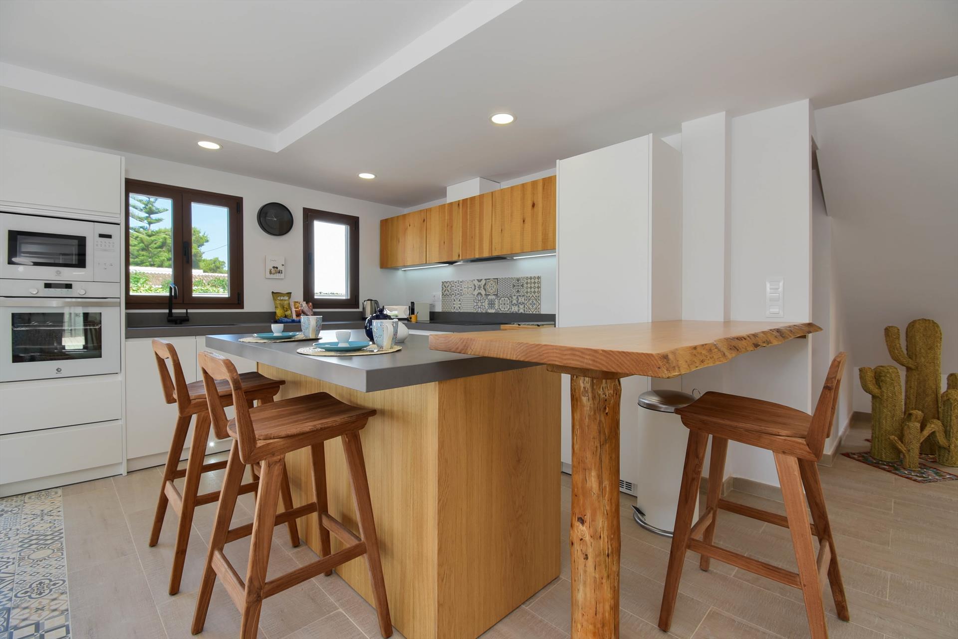 • cocina con vitrocerámica, horno eléctrico, microondas, lavavajillas, refrigerador-congelador, cafetera, tetera eléctrica, batidora, tostadora y exprimidor