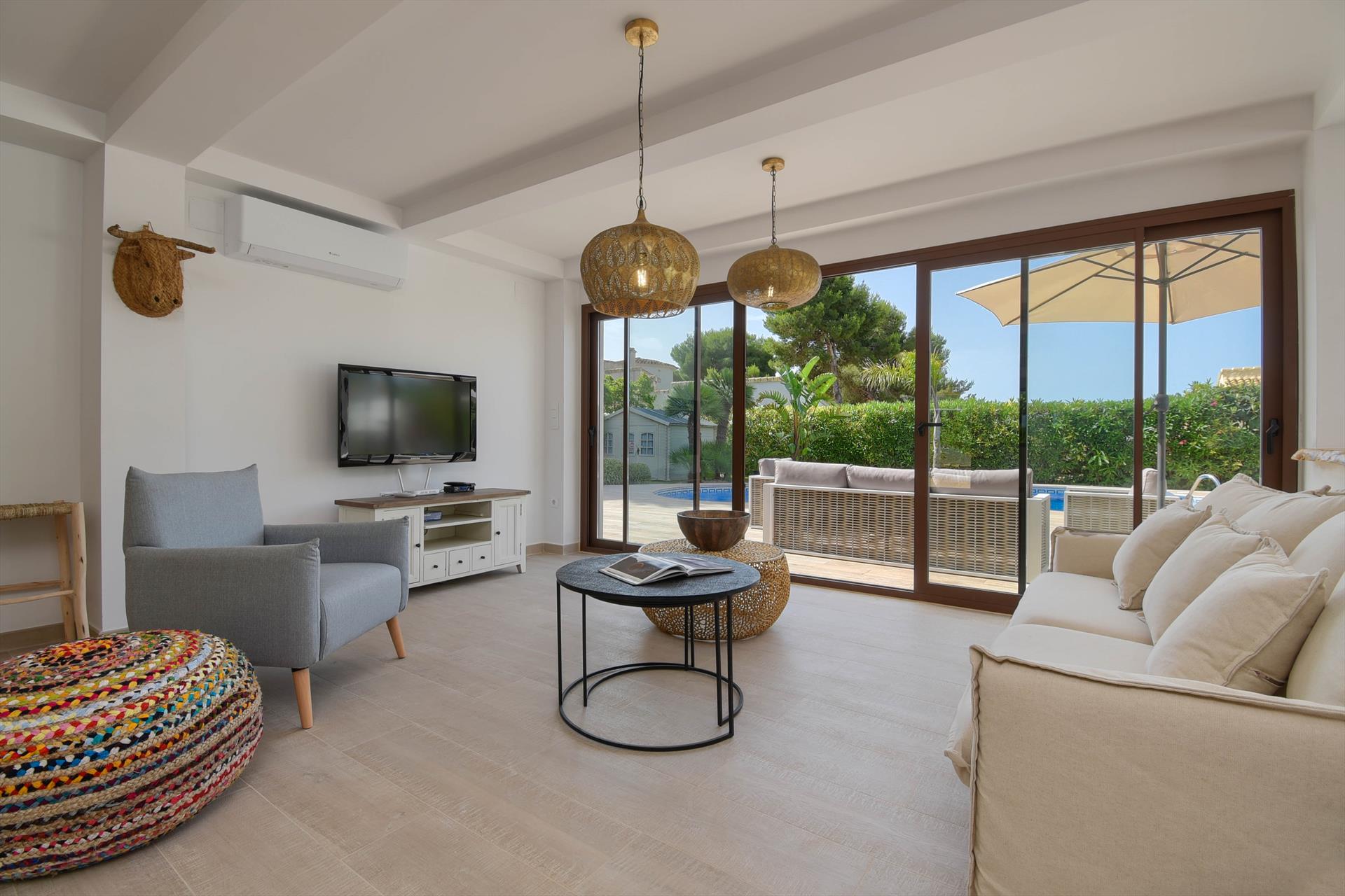 Hermosa y cómoda villa en Javea, Costa Blanca, España, con piscina climatizada para 4 personas. La casa está situada en una zona residencial cerca de la playa y se encuentra a 3 km de la Cala de la Barraca, en la playa de Javea.