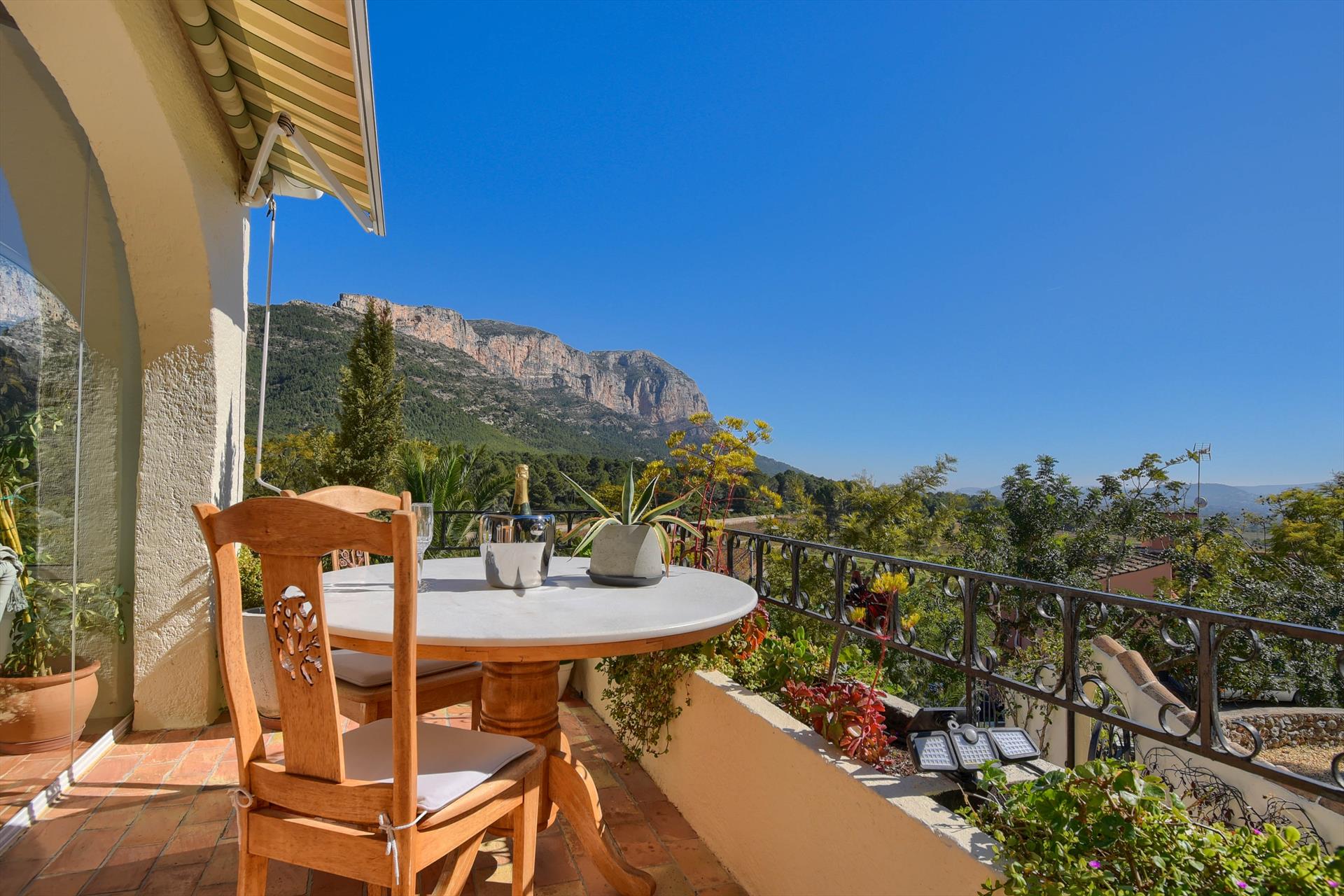 La villa tiene 3 dormitorios, 2 cuartos de baño y 1 aseo para invitados, distribuidos en 2 plantas. El alojamiento ofrece privacidad, un jardín bonito con gravilla y árboles frutales, una piscina bonita y unas preciosas vistas a la montaña y viñedos. El confort y la cercanía de sitios para salir, actividades deportivas, lugares para ir de compras, lugares de interés y cultura hacen de esta villa un alojamiento apropiado para pasar sus vacaciones en España con familia o amigos.